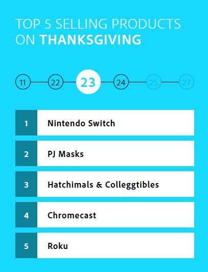 Posteriormente, el 22 de noviembre, antes del Día de Acción de Gracias, la consola de Nintendo subió un peldaño y quedó en tercer lugar de los productos más vendidos. Cabe mencionar que ese día también contó con presencia del dispositivo de Sony, PlayStation VR y de Super Mario Odyssey, uno de los juegos más importantes de Switch en el año.
